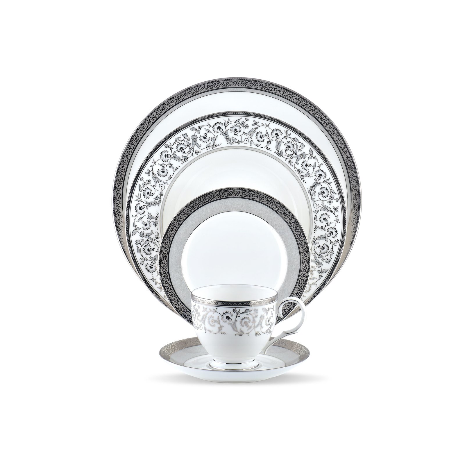 12 Dinner Plates , 12 Salad Plates ,12 soup plates, 12 Bread & Butter plates, 12 Fruit saucers, 12 Coffee Cups, 12 Coffee Saucers, 12 Tea Cups , 12 Tea Saucers, 6 Oval Platters, 2 Oval Vagetable Platters, 2 Gravy Boat + Tray , 4 (2) Covered Vagetables , 2 Tea pot + Cover, 2 Sugar bowl + Cover , 1 Creamer