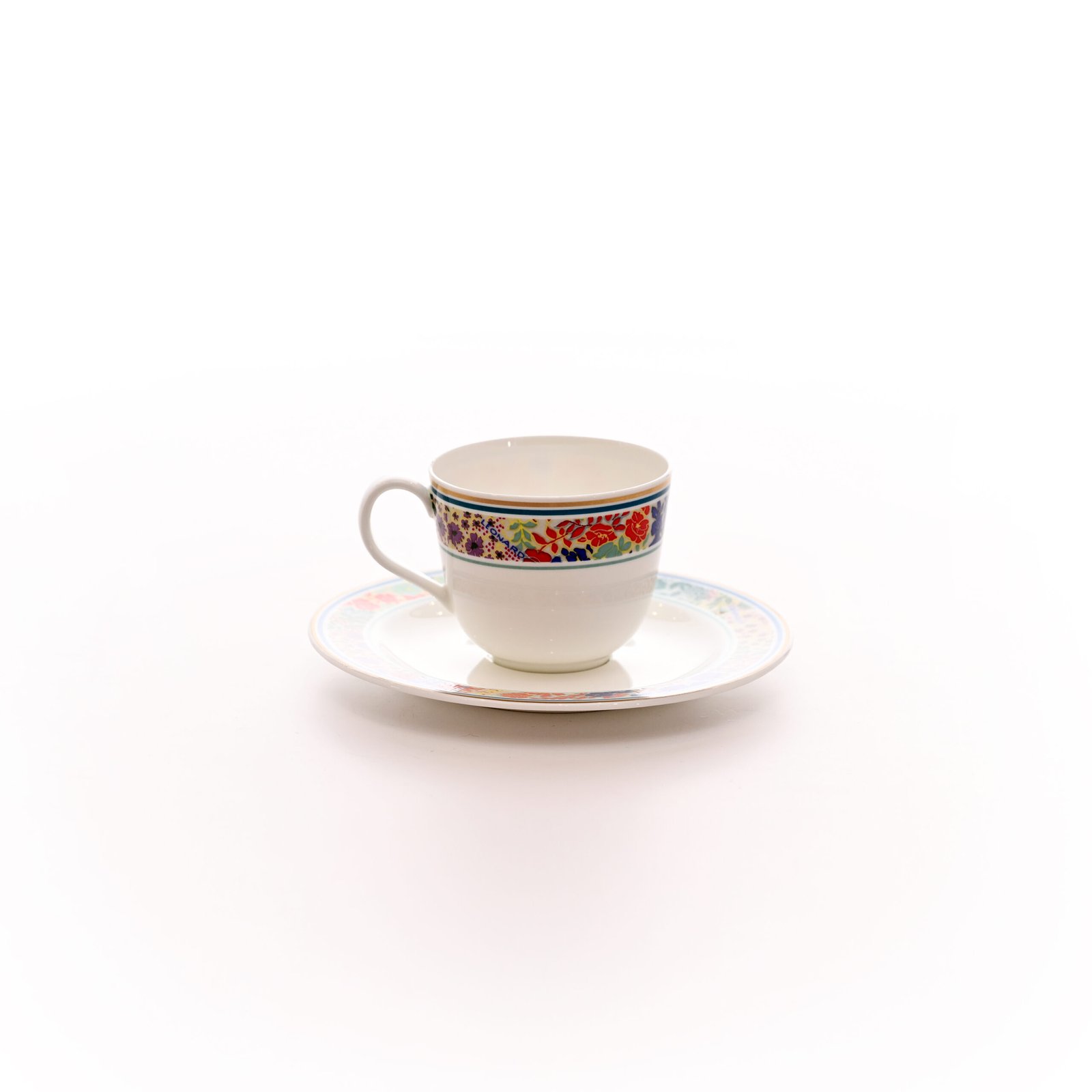 أضف جمال الطبيعة والألوان الزاهية إلى جلسات القهوة الخاصة بك مع فناجين قهوة كلاسيك  من Hutschenreuther الألمانية الفاخرة. طقم 6 فناجين قهوة مع 6 أطباق تقديم يتميز بزخارف زهور ملونة غنية (أحمر، أزرق، أصفر، أخضر) محاطة بحدود ذهبية رفيعة، على خلفية بيضاء ناصعة، مما يخلق مظهرًا نابضًا بالحياة وكلاسيكيًا في الوقت ذاته.