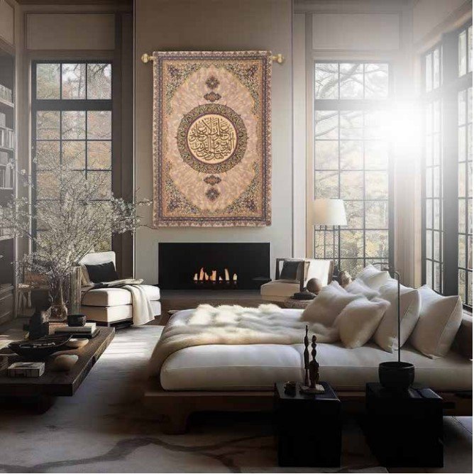 - متعدد الاستخدامات: معلقة جدارية فاخرة، سجادة زينة متوسطة، غطاء ديكوري للطاولات، أو خلفية فنية للصور والمناسبات الروحانية.